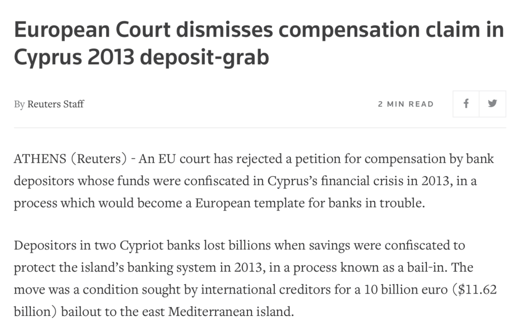 Tijdens de crisis in o.a. Cyprus (2013) hebben banken door het geld van investeerders en schuldeisers (rekeninghouders) te confisqueren, zichzelf overeind gehouden.