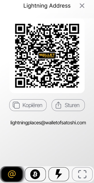 Het publieke Lightning ontvangstadres verschijnt hier als QR-code, in alfanumerieke vorm en tot slot als een soort e-mailadres formaat.